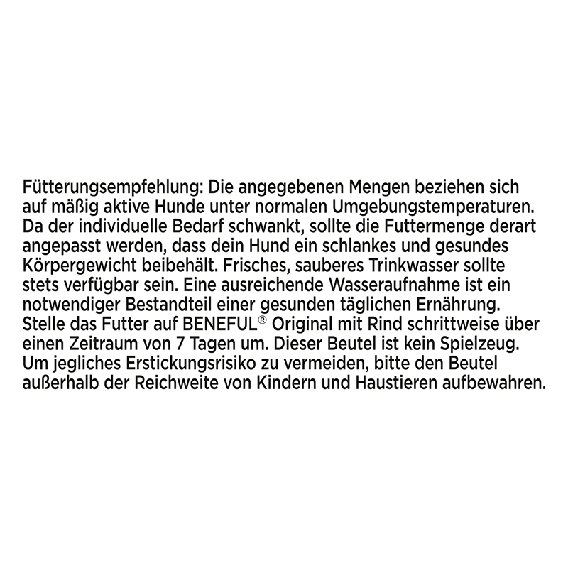 Die angegebenen Mengen beziehen sich auf mäßig aktive Hunde unter normalen Umgebungstemperaturen. Da der individuelle Bedarf schwankt, sollte die Futtermenge derart angepasst werden, dass dein Hund ein schlankes und gesundes Körpergewicht beibehält.