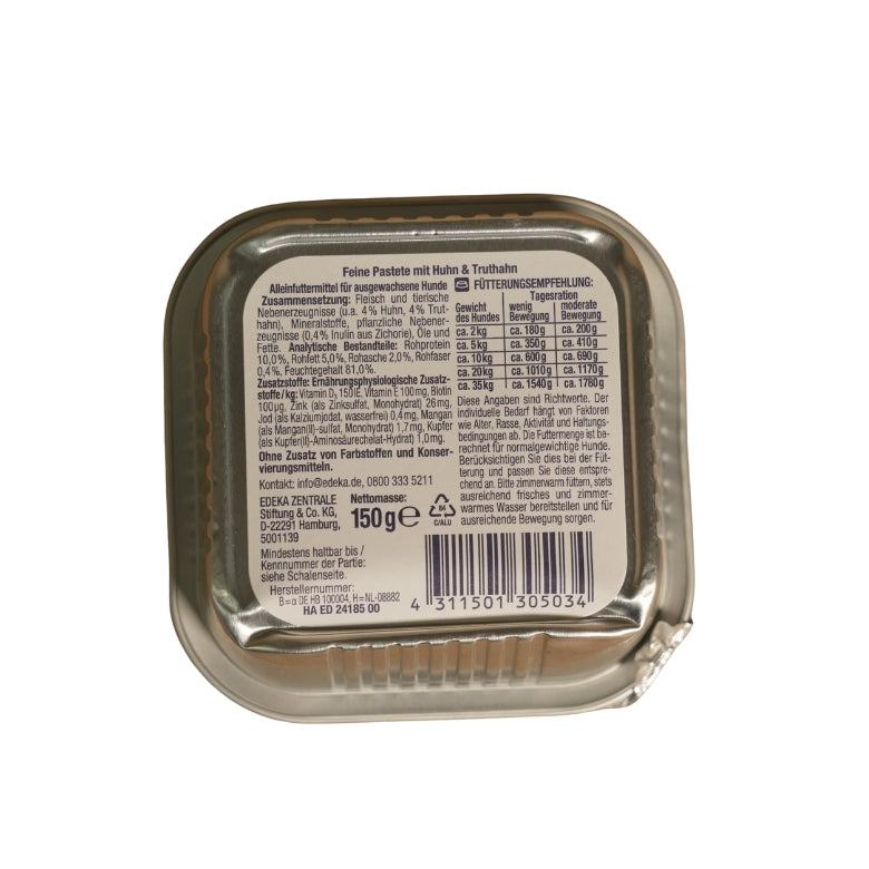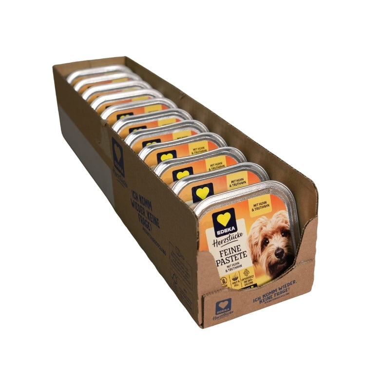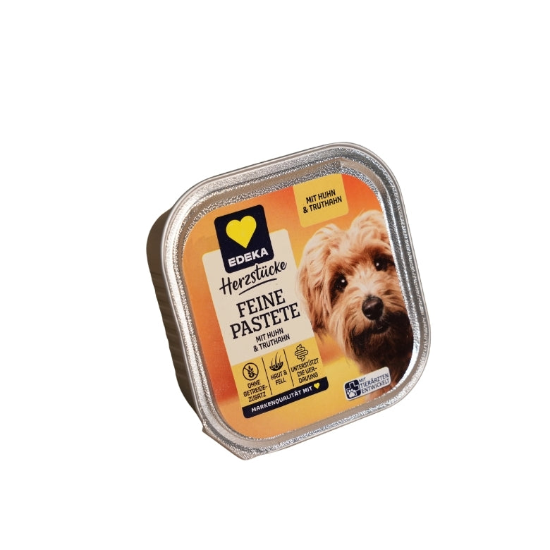 EDEKA Herzstücke Feine Pastete mit Huhn & Truthahn ist ein ausgewogenes und schmackhaftes Nassfutter, das deinem Hund eine vollwertige tägliche Mahlzeit bietet. Zartes Huhn- und Truthahnfleisch wird schonend zu einer feinen Pastete verarbeitet und überzeugt durch gute Verträglichkeit sowie hohe Akzeptanz.