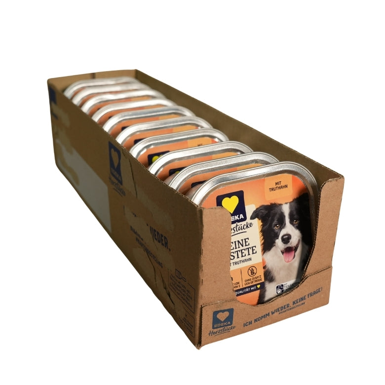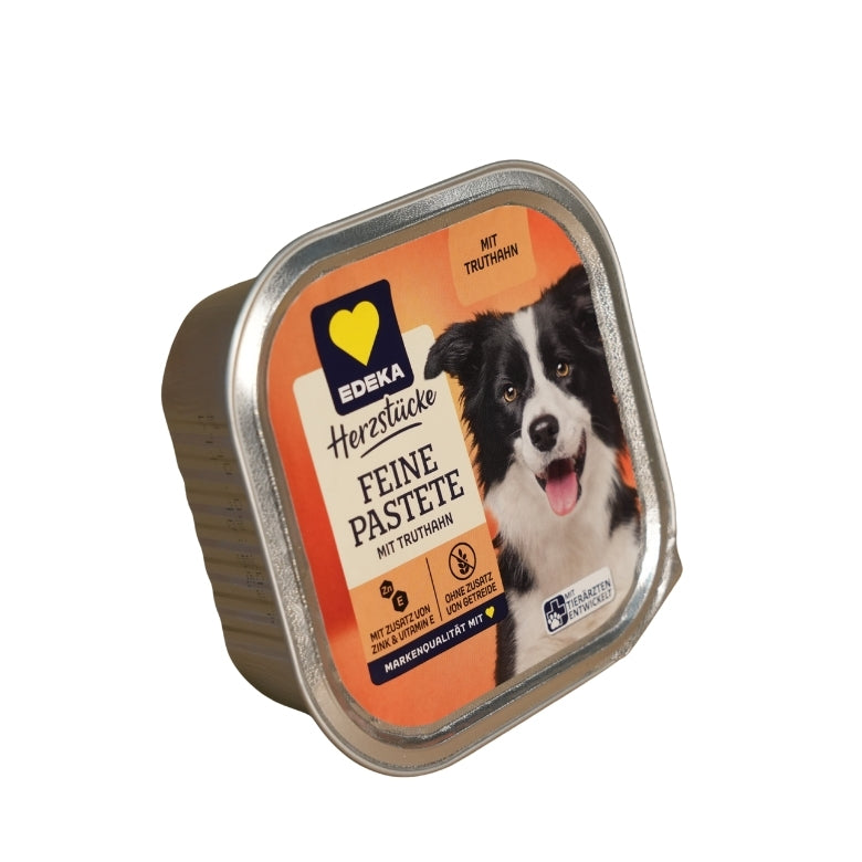 EDEKA Herzstücke Feine Pastete mit Truthahn ist ein ausgewogenes und schmackhaftes Nassfutter, das deinem Hund eine vollwertige tägliche Mahlzeit bietet. Zartes Truthahnfleisch wird schonend zu einer feinen Pastete verarbeitet und überzeugt durch gute Verträglichkeit sowie hohe Akzeptanz.